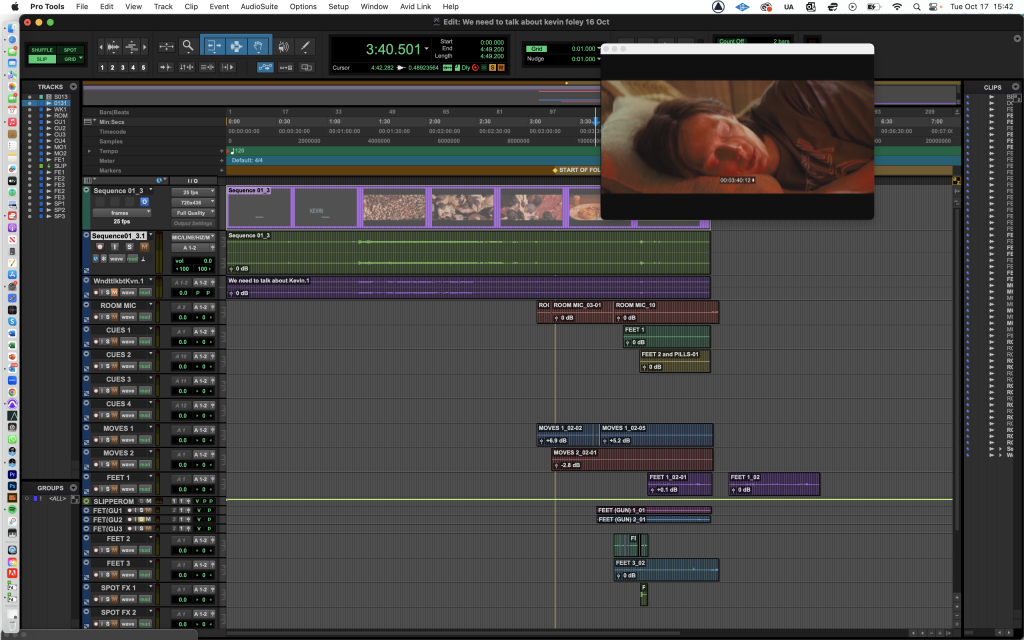 We used a single AKG large condenser microphone and a Senhiser shotgun microphone during the recording, and ran a Pro Tools session as well with the imported video. We all switched off between running the DAW and experimenting with live tracking for both footsteps and dropping a pill bottle, both taking place towards the end of our assigned scene. Experimenting with weight and different tonal qualities dependent on which material we used to walk on were basic factors in the output for recording the bare footsteps, however, the most difficult task seemed to be getting the tempo of the footsteps aligned to picture. In the end we just decided it would be easier to manipulate in the DAW, rather than continuously reattempt the full scene. I quickly developed a great admiration for foley artists.